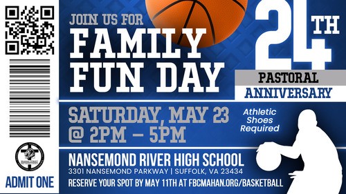 Celebrate our 24th Pastoral Anniversary with us in a fun and active way, on the court! We're hosting a community basketball game on Saturday, May 23, 2026 from 2 PM – 5 PM at Nansemond River High School (3301 Nansemond Parkway, Suffolk, VA 23434)