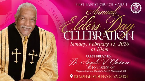 Join us for our Annual Elders Day Celebration on Sunday, February 15, 2026, as we gather in worship to honor the wisdom, faith, and legacy of our elders. We are excited to welcome Dr. Angelo V. Chatmon, Senior Pastor of Pilgrim Journey Baptist Church in Richmond, Virginia, as our guest preacher. This special service will be a time of gratitude, reflection, and praise as we celebrate God’s faithfulness through generations.