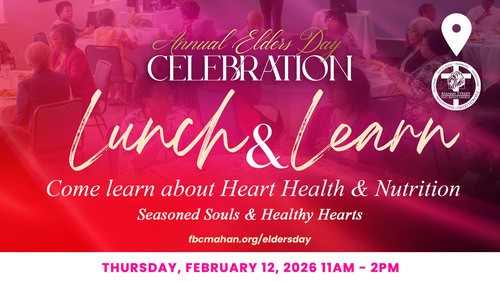 We invite our Elders to attend Lunch & Learn: Seasoned Souls & Healthy Hearts, a special gathering focused on heart health, nutrition, and overall wellness. This informative and engaging session will provide practical insights while fostering meaningful conversation and fellowship. Come enjoy a nourishing lunch and learn how to care for the bodies God has blessed us with, mind, body, and spirit.